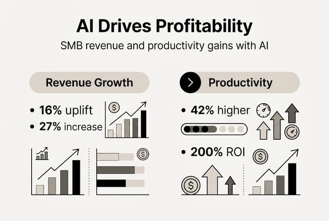 | AI drives major profit gains | SMBs leveraging AI typically see revenue growth of 16-27% and productivity boosts up to 42%. |