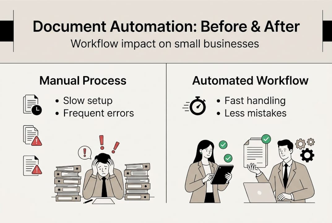 | Boosts SMB efficiency | Small businesses see fewer errors, faster approvals, and accelerated processes with document automation. |