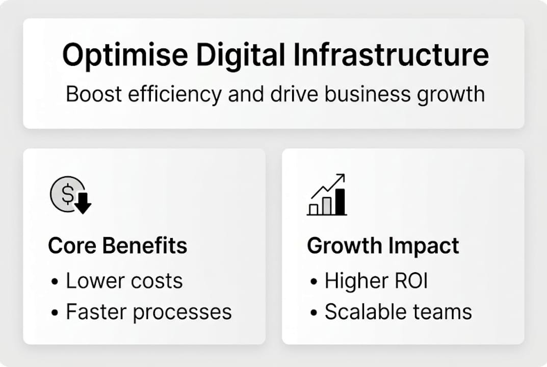 The scalability benefit is equally important. A business running on optimised infrastructure can grow without proportionally growing its headcount. That is the core efficiency lever most owners miss.